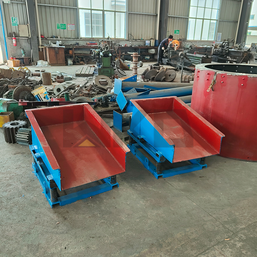 The electromagnetic vibrating feeder is consist of feeding trough, exciter, spring bearing, transmission device etc. The vibration source of feeding tank vibration is exciter. The exciter is made up of two eccentric shafts and gears. The motor drives the main shaft through the triangle belt ,then the Good gear of the main shaft drive another shaft to rotate. The two shafts do reverse rotation at the same time and tank vibration to make the materials moving continuously. Thus they can achieve the goal of transporting materials.